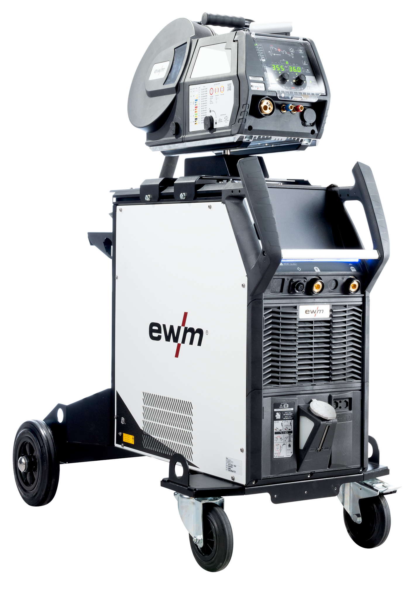 - Drive XQ / Drive XQ IC 200 mit hochpräzisem, kraftvollen 4-Rollen-Antrieb EWM eFeed zum sicheren Fördern aller Massiv und Fülldrähte